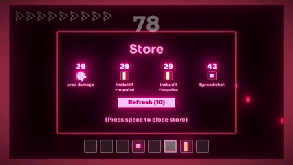 Aim with mouse, shoot to move, dodge enemies, collect orbs, then reopen the shop to adjust your pattern.